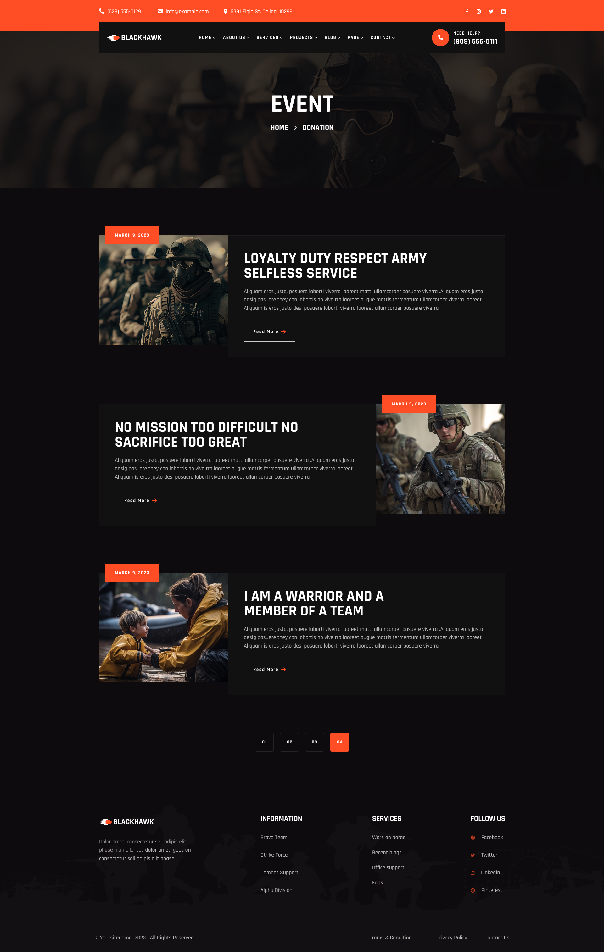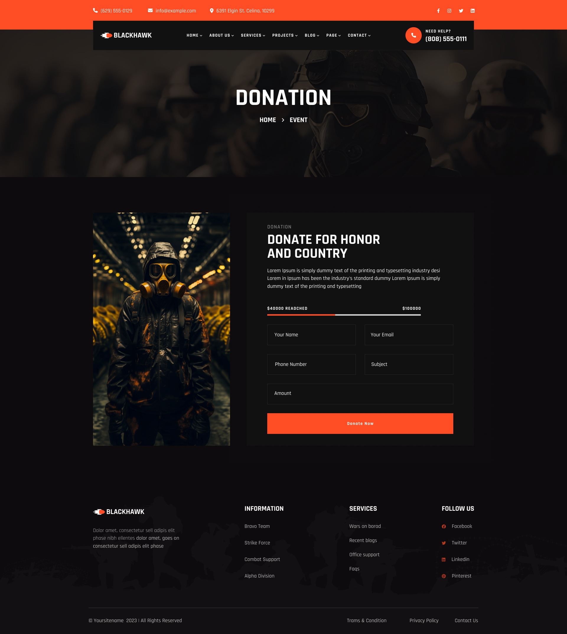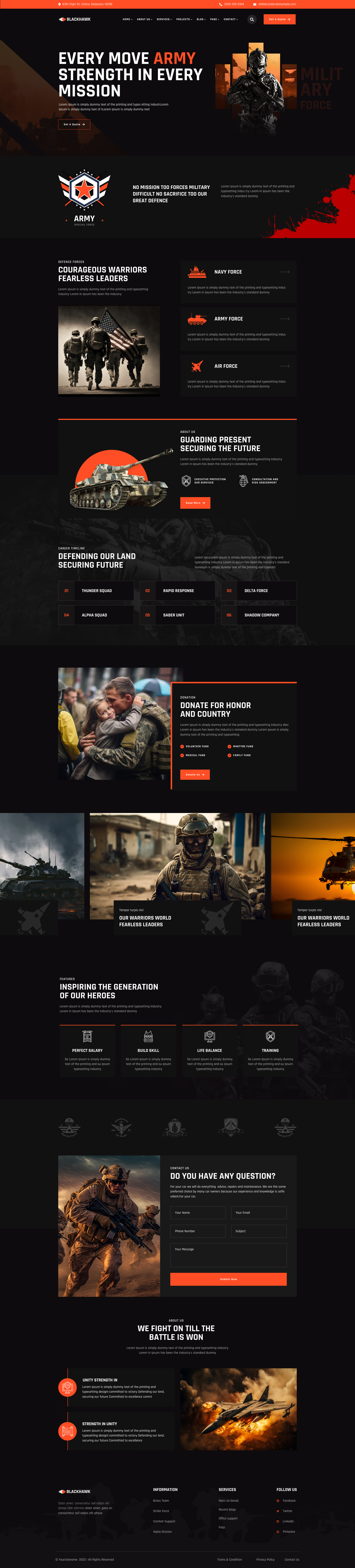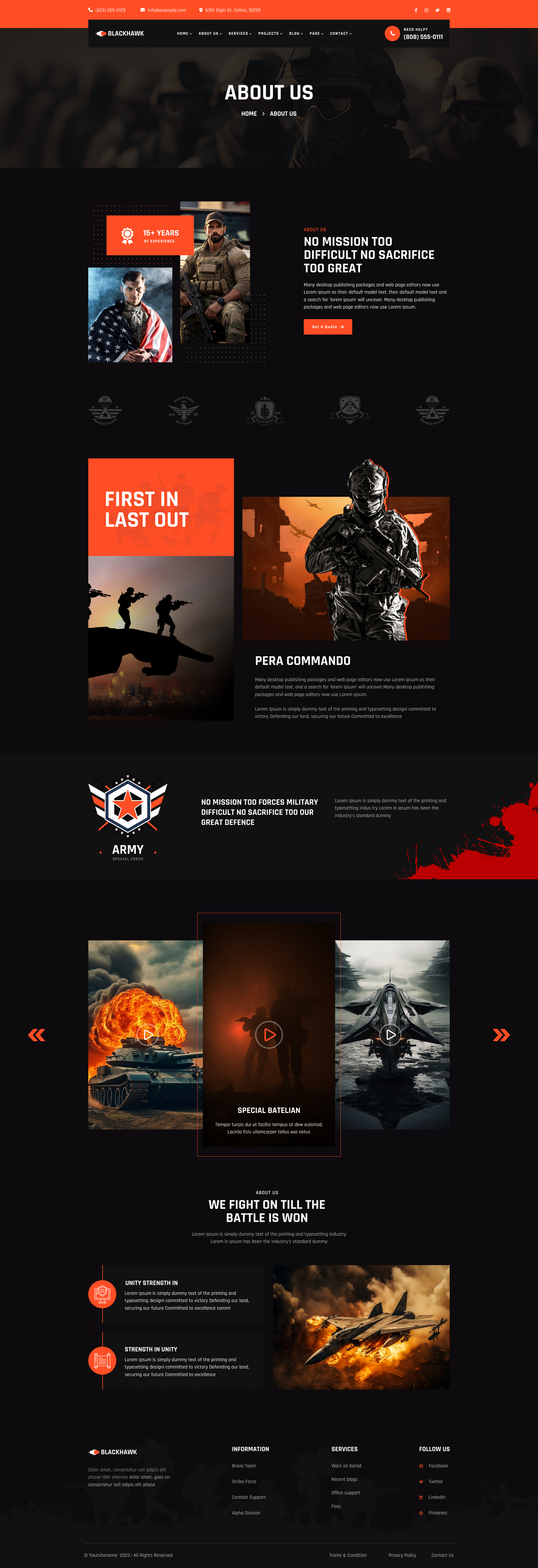 BlackHawak – Military Service HTML5 Template, Built with the world’s most popular responsive CSS framework Bootstrap. This is a clean and modern template that uses army, aviation, commando, community, donation, guard, military, navy, officer, recruiting, security, service, squad, veterans, war, and any kind of Military Service. It has a lot of features and responsive pages. It has a lot of features and responsive pages.