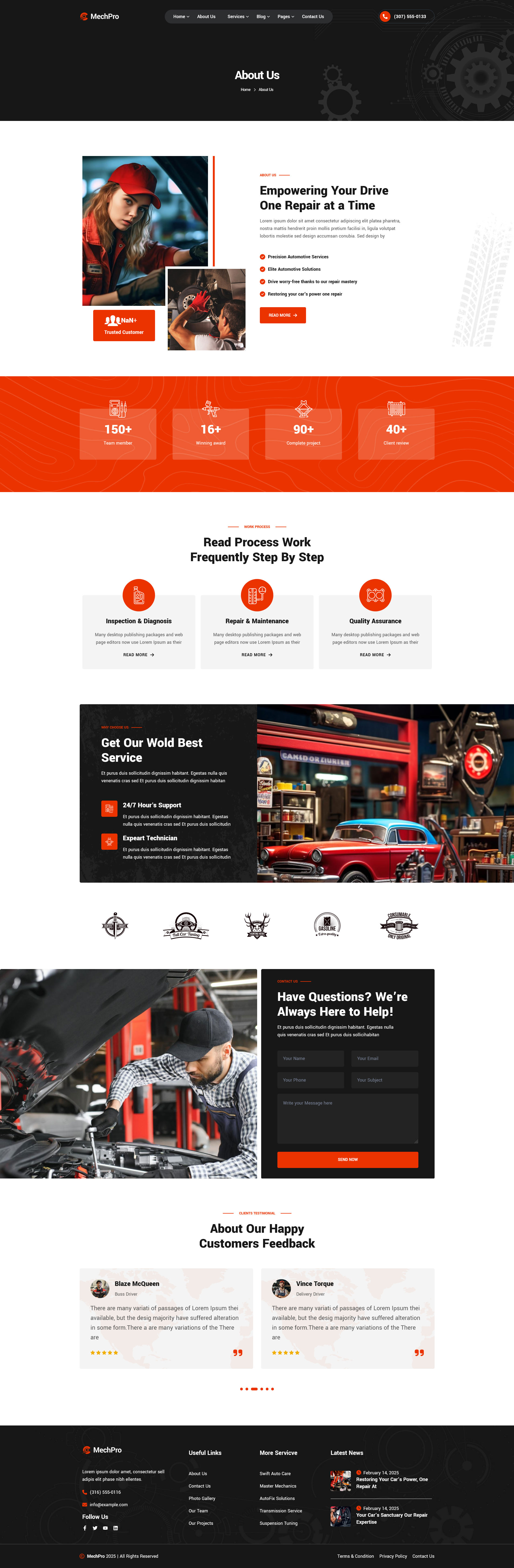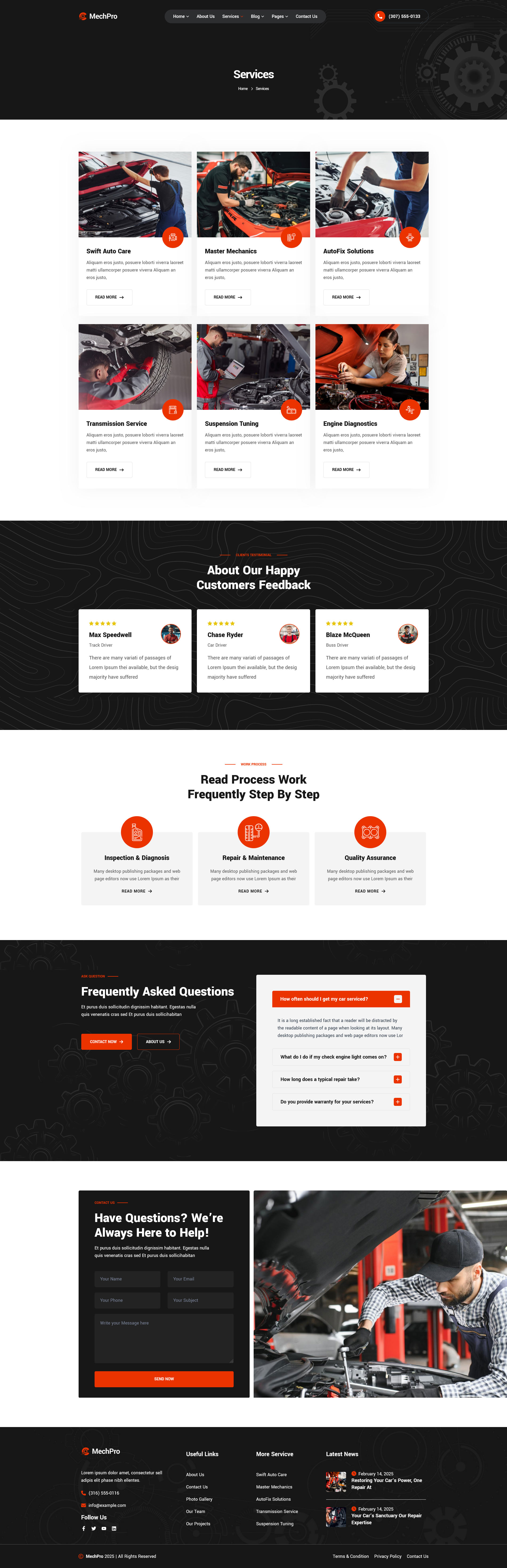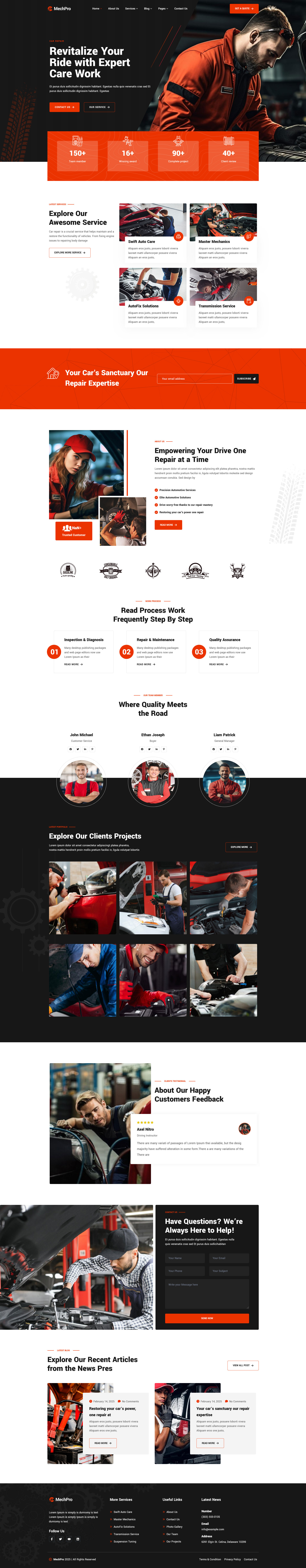 Mechpro is ready to use from the box. Quickly install it via FTP or WordPress and after you activate it you can load demo content. Then you can add your own content on already designed pages.