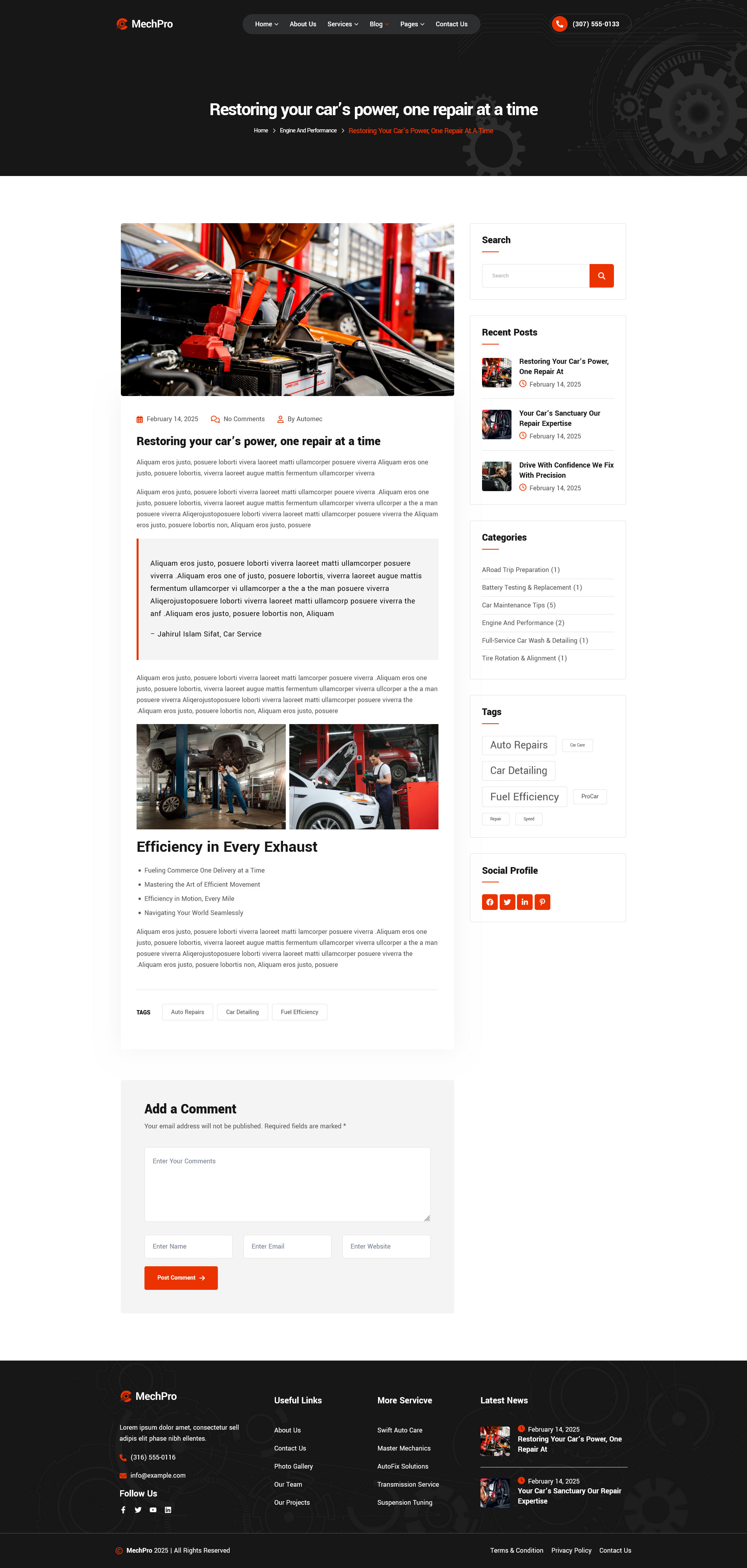 Mechpro is a stunning, professional and flexible Car Service & Repair Company WordPress theme. Mechpro based on in-depth research into Car Service & Repair Company, to deliver all needed layouts and blocks.